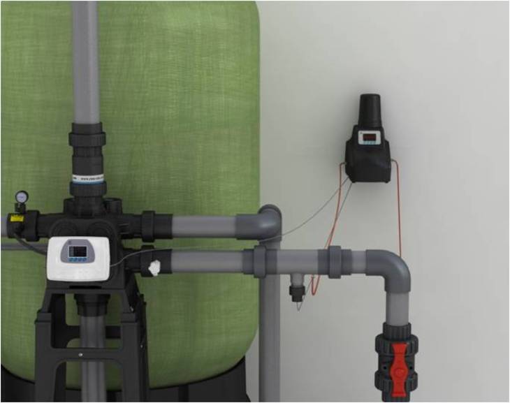 该端口可接收外部有源信号,电压DC5~24V,来控制阀门。如可接收PLC发出的信号、电导率仪发出的信号等。当接收到信号后,程序控制阀门进入下一个工位。如控制阀在运行状态,当远程控制端口接收到一个信号后,控制阀进入反洗状态;控制阀在吸盐状态时,当远程控制端口接收到一个信号后,控制阀进入下一个状态。
