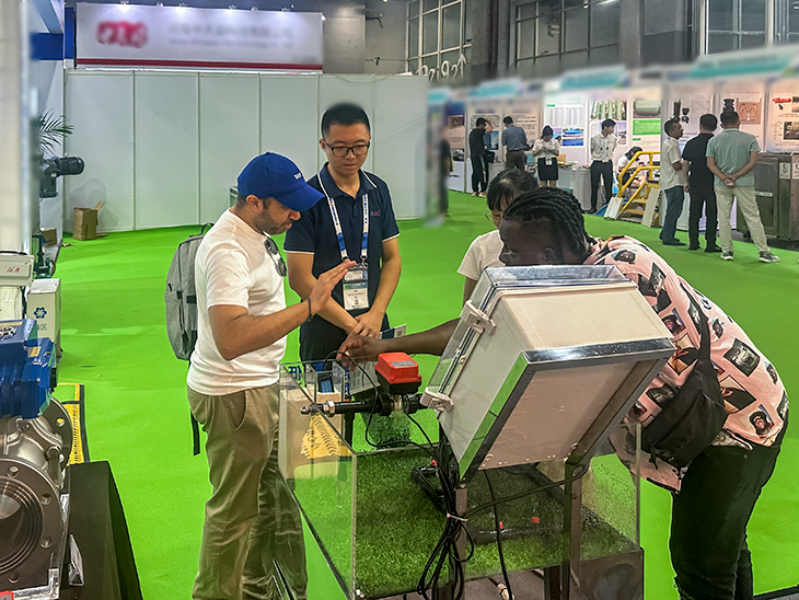 润景智灌阀是润新公司基于陶瓷硬密封球阀以及温度湿度传感器、物联网和光伏发电技术而研发的高效自动节水灌溉系统,可根据土壤湿度情况自动浇灌,可通过手机/电脑远程控制,适用于农业大田灌溉、市政园林浇灌和温室大棚灌溉等场合,获国内外客商关注,一些客商驻足观看产品功能演示,详细咨询技术特点和应用情况。
