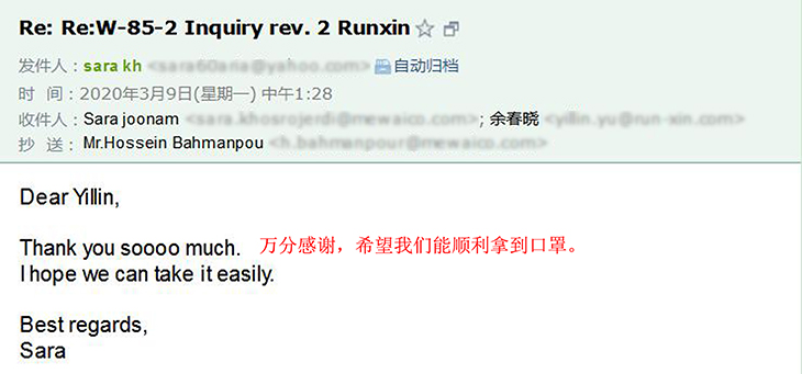 3月7日上午,润新公司向全球代理商发出了一份英文邮件,表示愿为他们提供力所能及的帮助,并于当天便向伊朗、韩国、意大利、匈牙利、法国、西班牙、比利时、拉脱维亚等代理商寄去防护口罩,希望他们做好防护工作,客户们纷纷回复邮件表示感受到了润新公司“国际大家庭”的温暖。