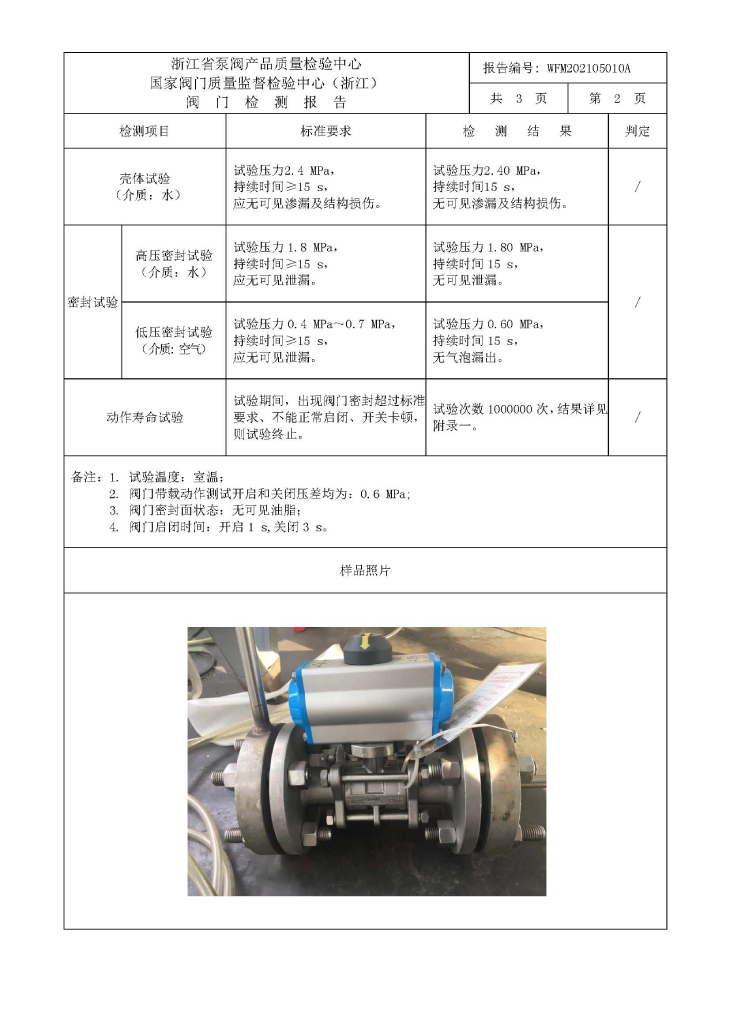 近日,浙江省泵阀产品质量检测中心、国家阀门质量监督检测中心(浙江)出具检测报告——润景陶瓷硬密封球阀通过动作寿命试验,启闭1000000次无泄漏!